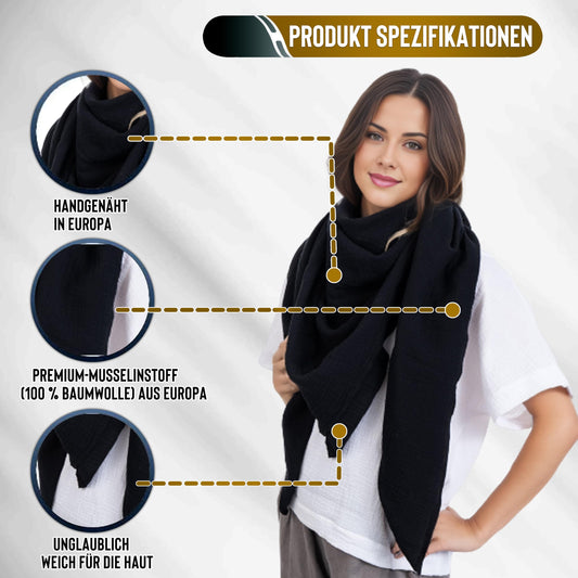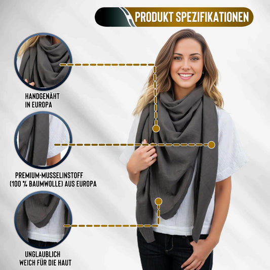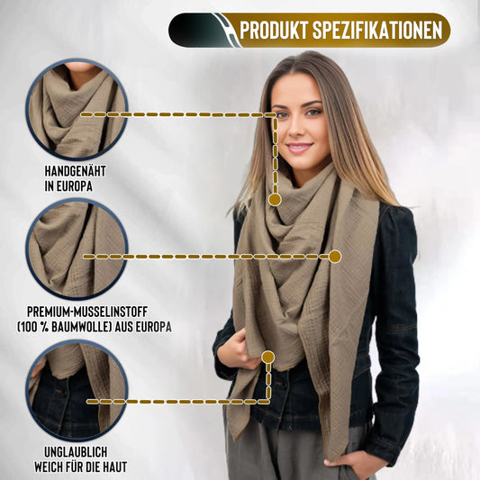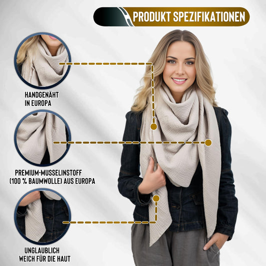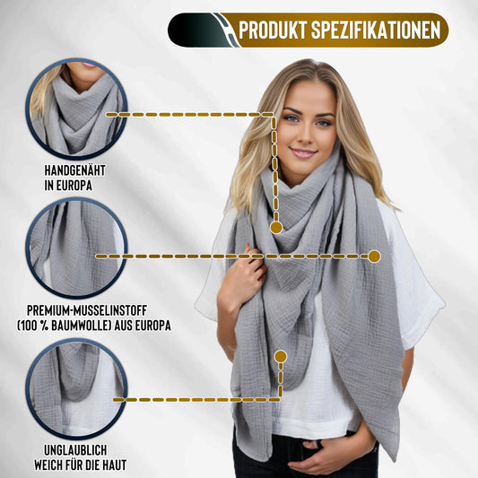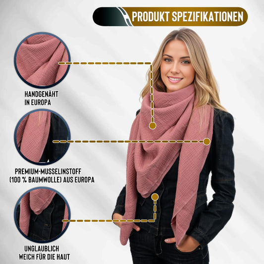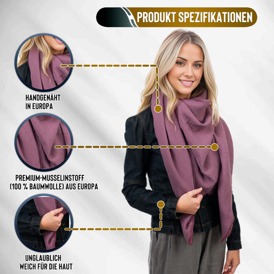 Dieser vielseitige Musselin-Schal besteht aus weicher und atmungsaktiver Baumwolle und bietet sowohl Stil als auch Komfort. Erhältlich in sanften Farbtönen, eignet er sich perfekt für den Alltag und besondere Anlässe. Dank seiner großzügigen Größe kann er als Schal, Schultertuch oder sogar als Accessoire für die Babypflege verwendet werden. Pflegeleicht und maschinenwaschbar – eine praktische und stilvolle Wahl.