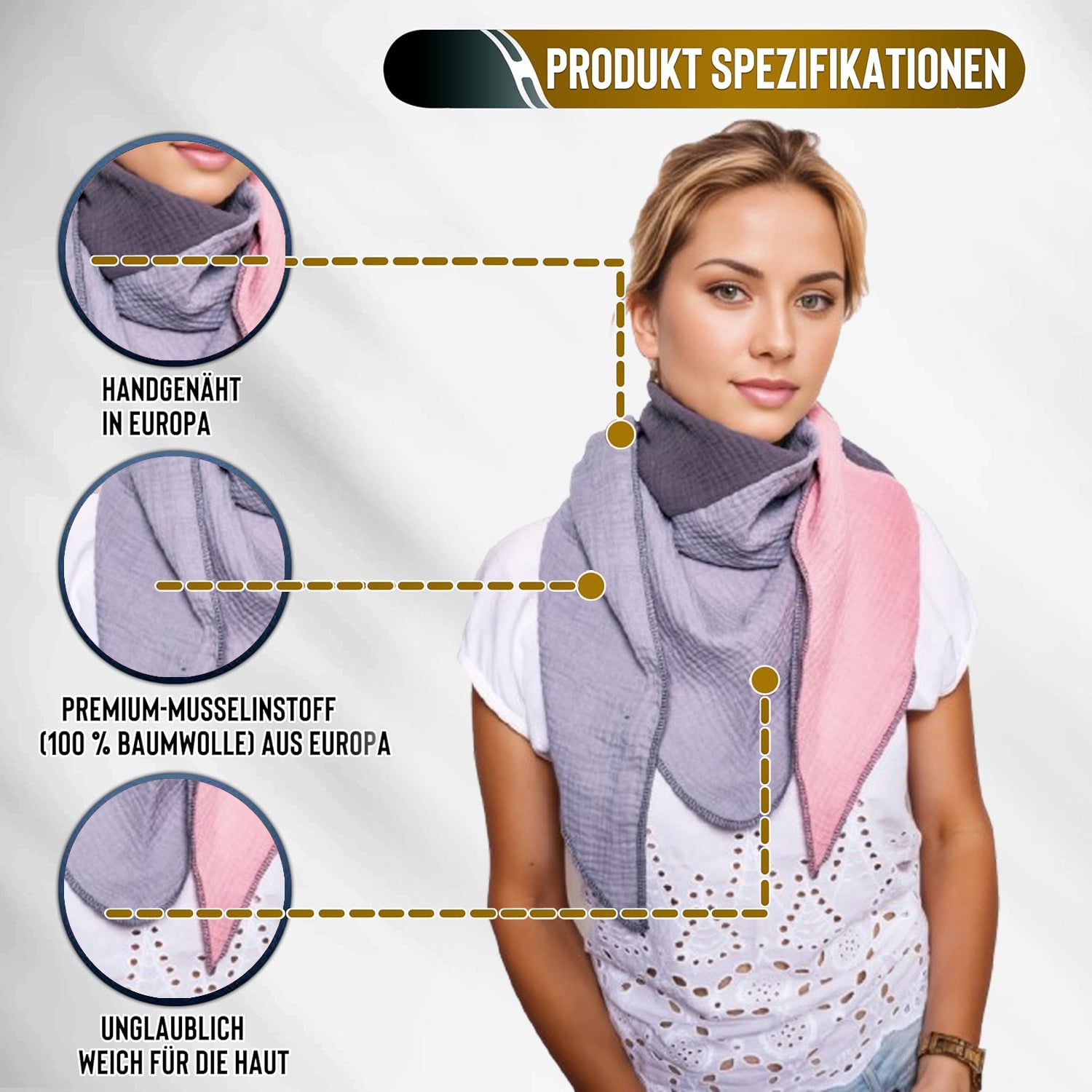 🪶 LEICHT UND BEQUEM - Musselin Tuch Damen besteht ausschließlich aus 100 % hochwertigem Doppelgaze-Baumwollstoff (Musselin) . Musselin Halstuch Damen muss nicht gebügelt werden, ist einfach zu reinigen und fühlt sich unglaublich weich auf der Haut an.