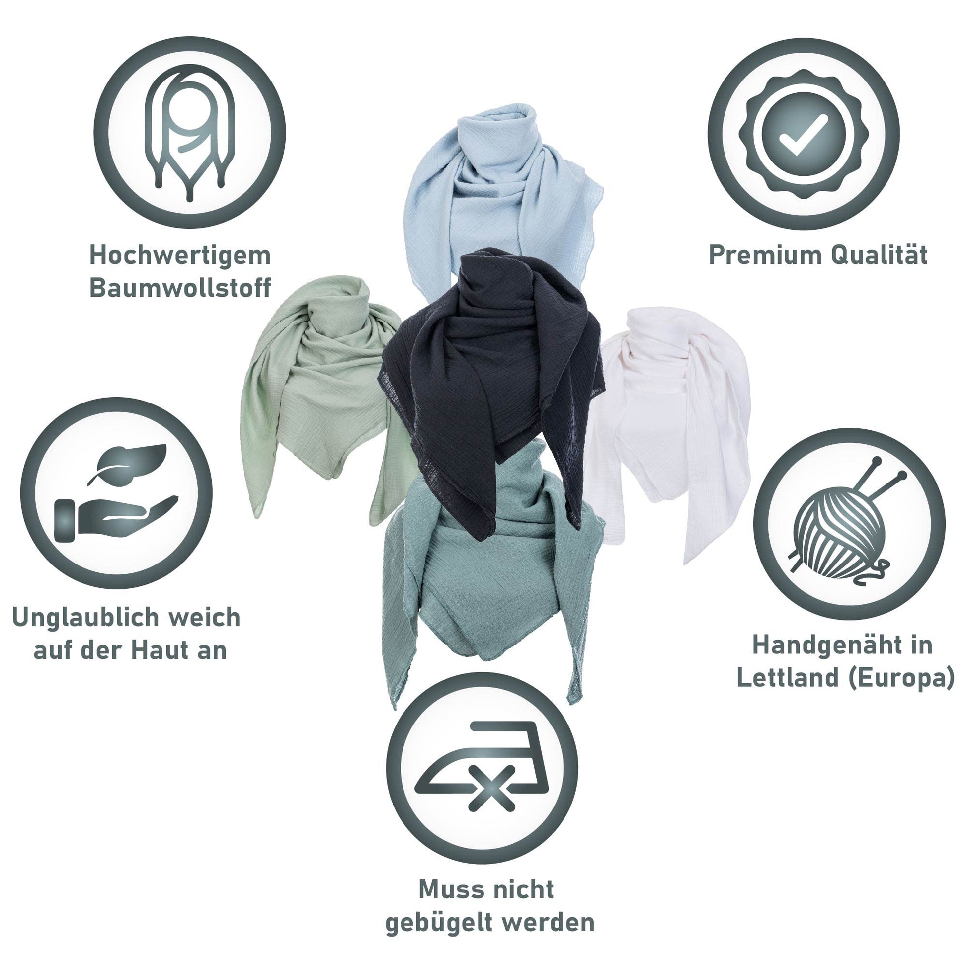 🪶 LEICHT UND BEQUEM - Musselin Tuch Damen besteht ausschließlich aus 100 % hochwertigem Doppelgaze-Baumwollstoff (Musselin) . Musselin Halstuch Damen muss nicht gebügelt werden, ist einfach zu reinigen und fühlt sich unglaublich weich auf der Haut an.