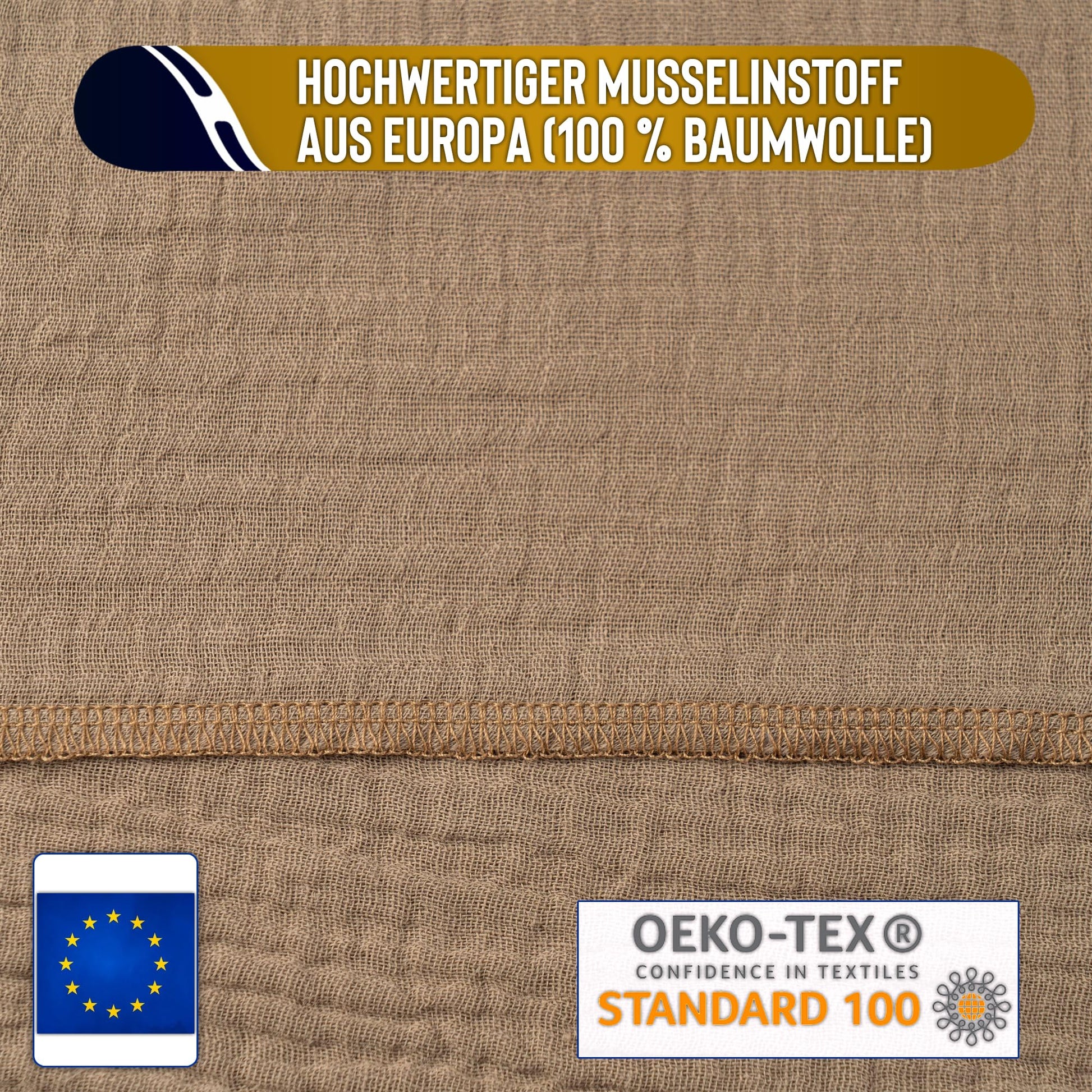 🍃 ATMUNGSAKTIVES MATERIAL - Unser Baumwollstoff ist mit dem ÖKO-TEX Standard 100 zertifiziert, was bedeutet, dass bei der Herstellung des keine schädlichen Chemikalien verwendet werden. Der weiche Musselin Stoff ist atmungsaktiv und schweißabsorbierend, was das Tuch zu einer guten Wahl für den täglichen Gebrauch macht.